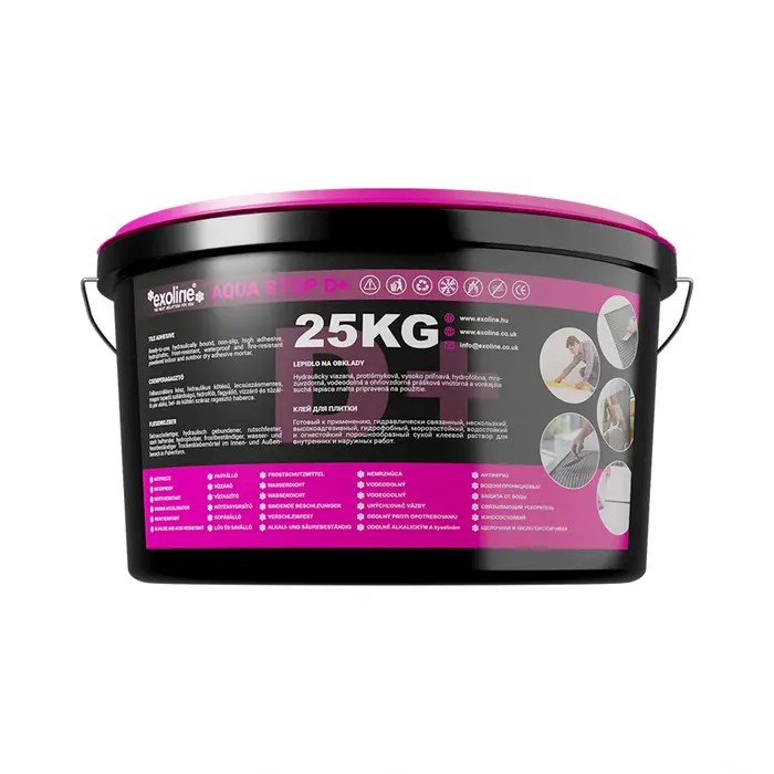 Az Exoline® Aqua Stop D+ vízzel való keverés után egyszerűen bedolgozható, nagy tapadó szilárdságú, stabil és kiválóan bedolgozható ragasztó rahabarcsot képez. Exoline® Aqua Stop D+ víz és időjárásálló, magas tapadó szilárdsággal és rugalmassággal rendelkező réteggé szilárdul.