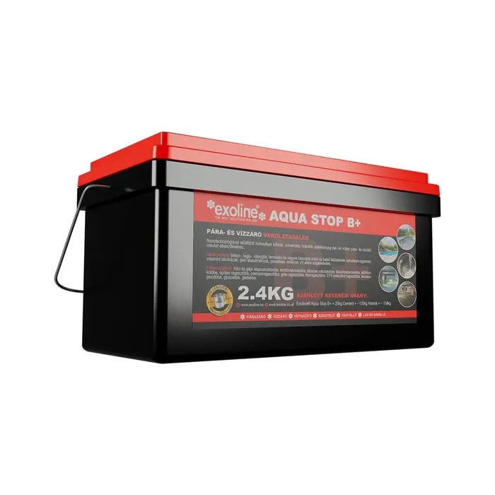 Előszőr: Az Exoline® Aqua Stop B+ adalékot adjuk hozzá bármely forgalomban lévő 25kg-os kézi alapvakolathoz. (A 2,4kg-os műanyag vödör tartalma 6db 25kg-os zsákos termékbe adagolható.)