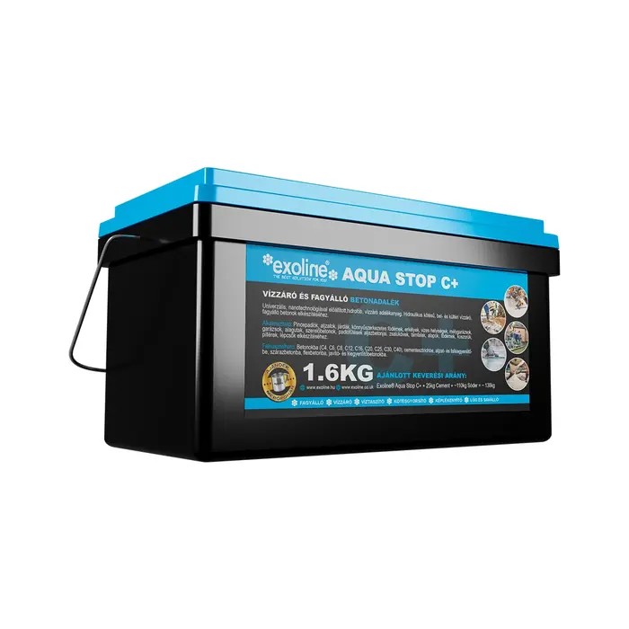 Előszőr: Az Exoline® Aqua Stop C+ adalékot adjuk hozzá bármely forgalomban lévő 25kg-os kézi alapbetohoz. (Az 1,6kg-os műanyag vödör tartalma 8db 25kg-os zsákos termékbe adagolható.)